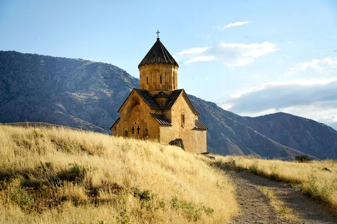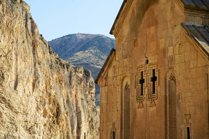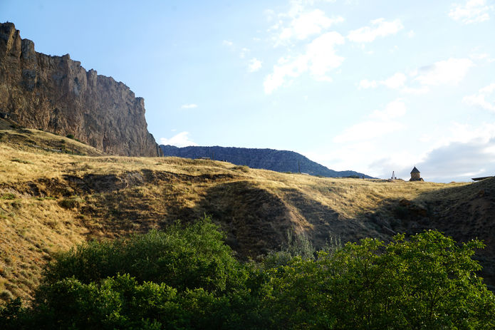 Overlooking the village of Areni on the eastern bank of the river Arpa lies the Saint Astvatsatsin Church. With views of the church at nearly every spot in the valley, this structure has watched over the “land of wine” since its construction in 1321 AD. A resemblance can be made with the nearby, and much more famous, Norovank Monastery, thanks to the same architect who designed the iconic structures: Momik. Momik gained fame for his high relief carvings, such as found on khachkars near the church and on the outside of the main structure. Also as architect, the church, alongside Noravank, have a distinctive, yet proudly Armenian, appearance with its thin yet tall stones stretching to the heavens.