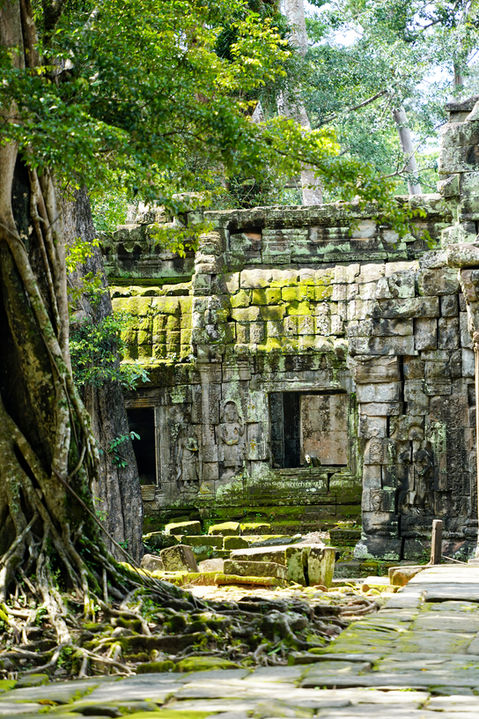 Left largely unrestored since being abandoned in the 15th century, with temple ruins overgrown by jungle foliage, trees and vines.